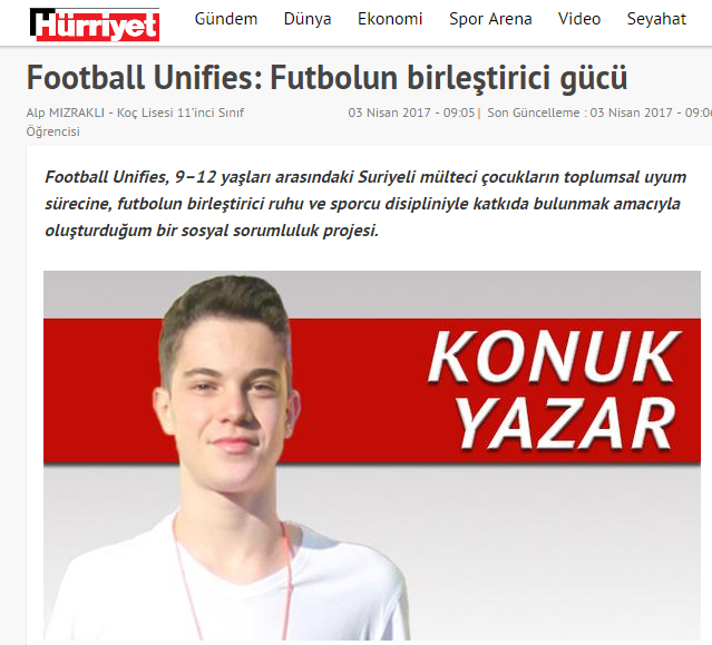 Our project will proceed with its second period which will start in September 2017, expanding its mentorship crew with the incoming junior high school student volunteers. After the project was announced in the social media, Instagram, Twitter, the popular newspaper Hürriyet http://mobil.hurriyet.com.tr/.football-unifies-futbolun-birlestirici-gucu-40414807 and then the Şalom Newspaper http://www.salom.com.tr/haber-102995-multeci, several of my friends volunteered as mentors for future projects. Thus, I am confident that we took the necessary steps to sustain the Football Unifies Project even after I graduate from high school.